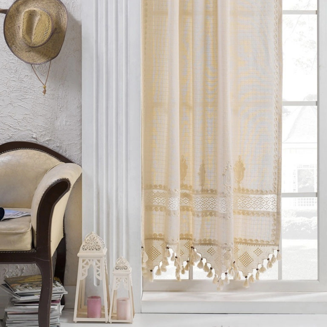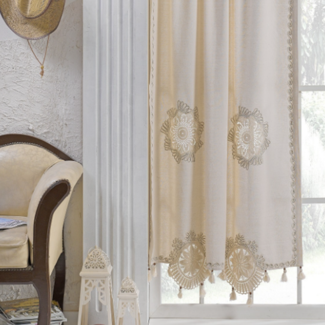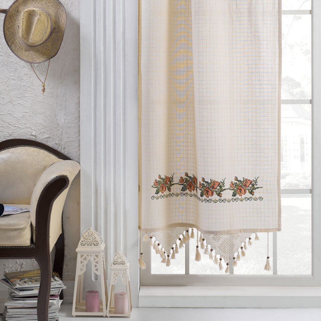 Made from natural cream-colored cotton, this elegant curtain features brown cross-stitch embroidery that adds warmth and authenticity to any interior.